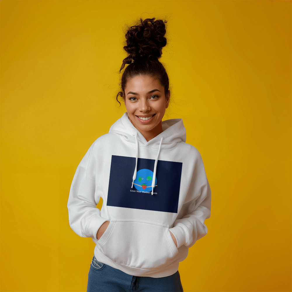 Show your love for the planet with this whimsical hoodie featuring a cartoon Earth hugging a green heart. Crafted from a cozy 60% cotton / 40% poly blend, it's soft, warm, and ready for everyday adventures.