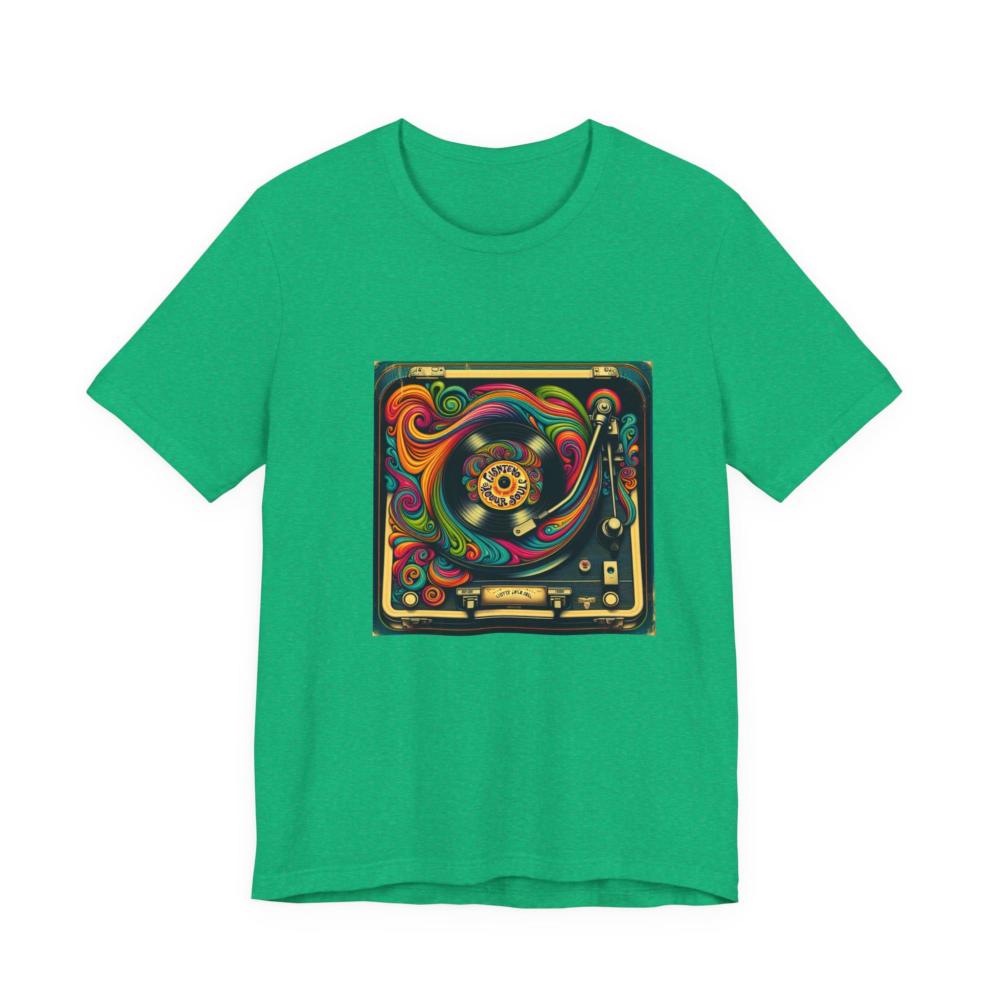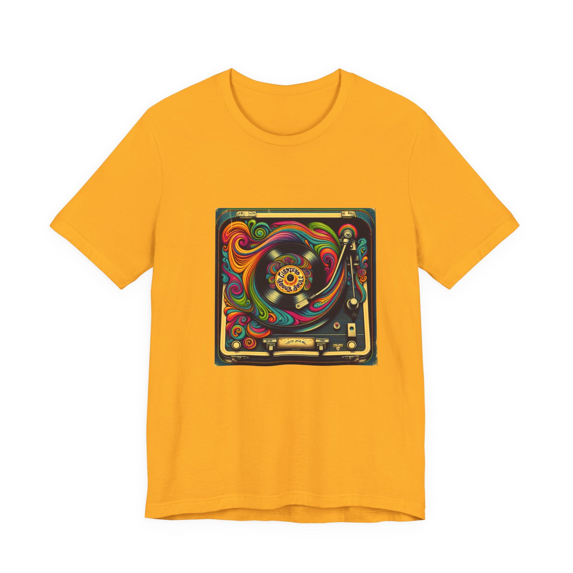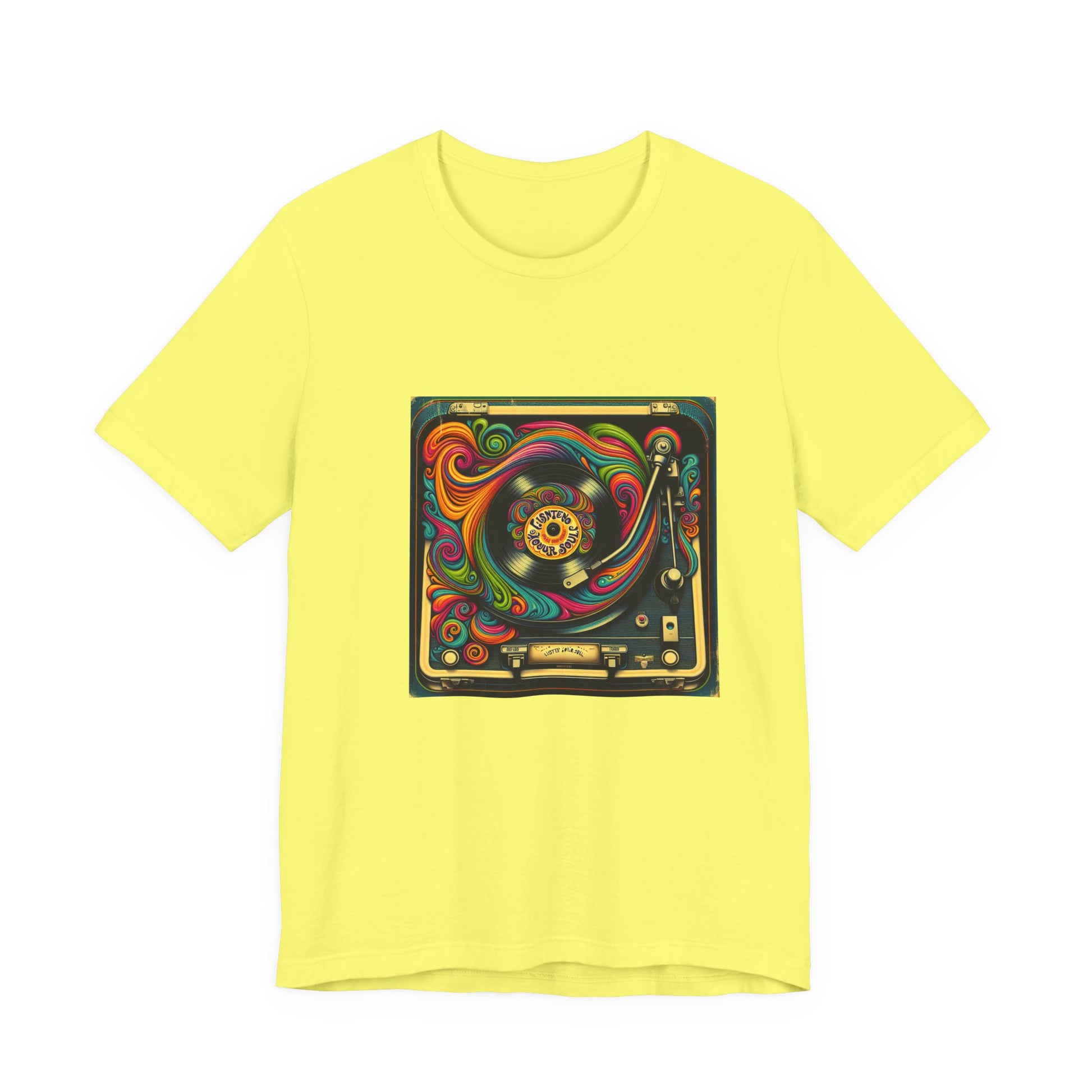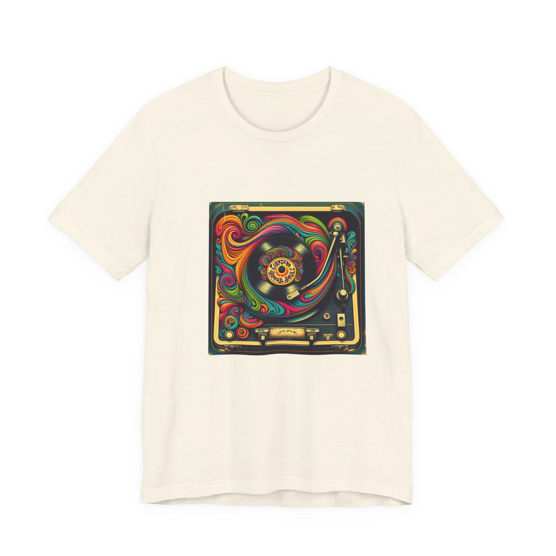 Unisex jersey short sleeve T-shirt with a psychedelic 1970s-inspired vinyl record player design and retro fonts reading 'Listen to Your Soul'. Perfect for music lovers and festival vibes.