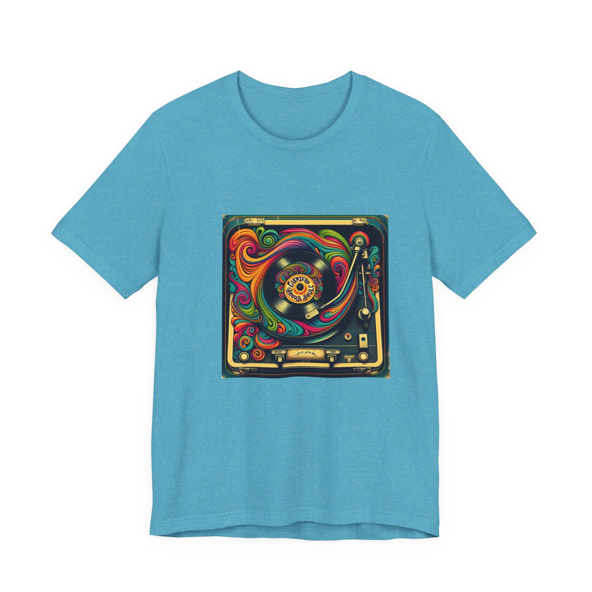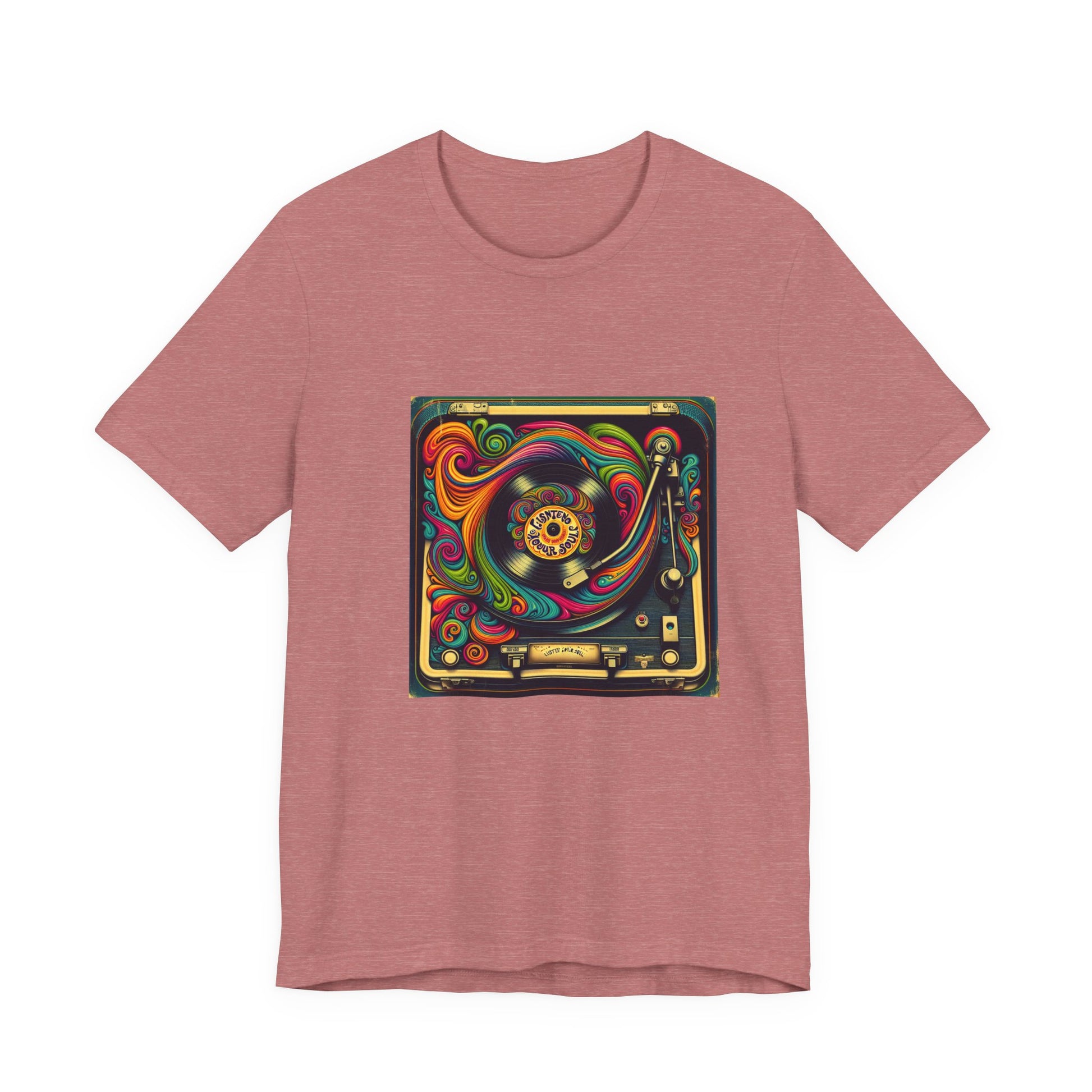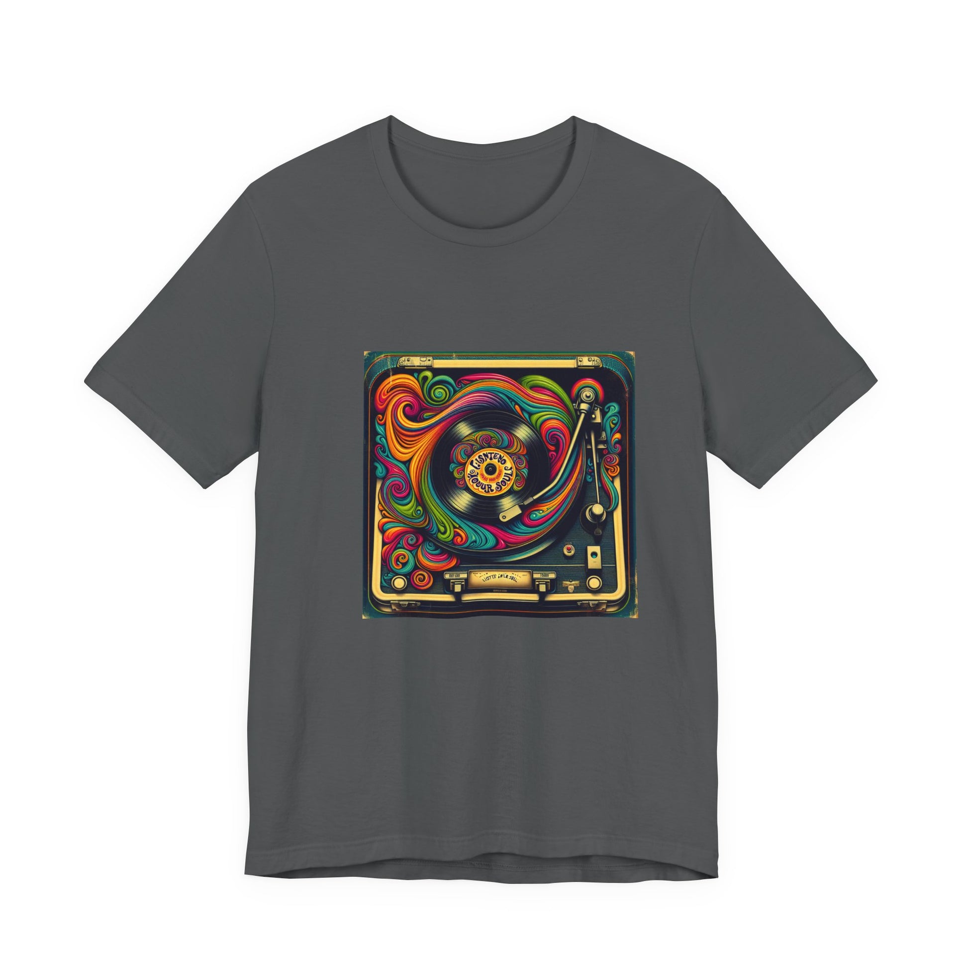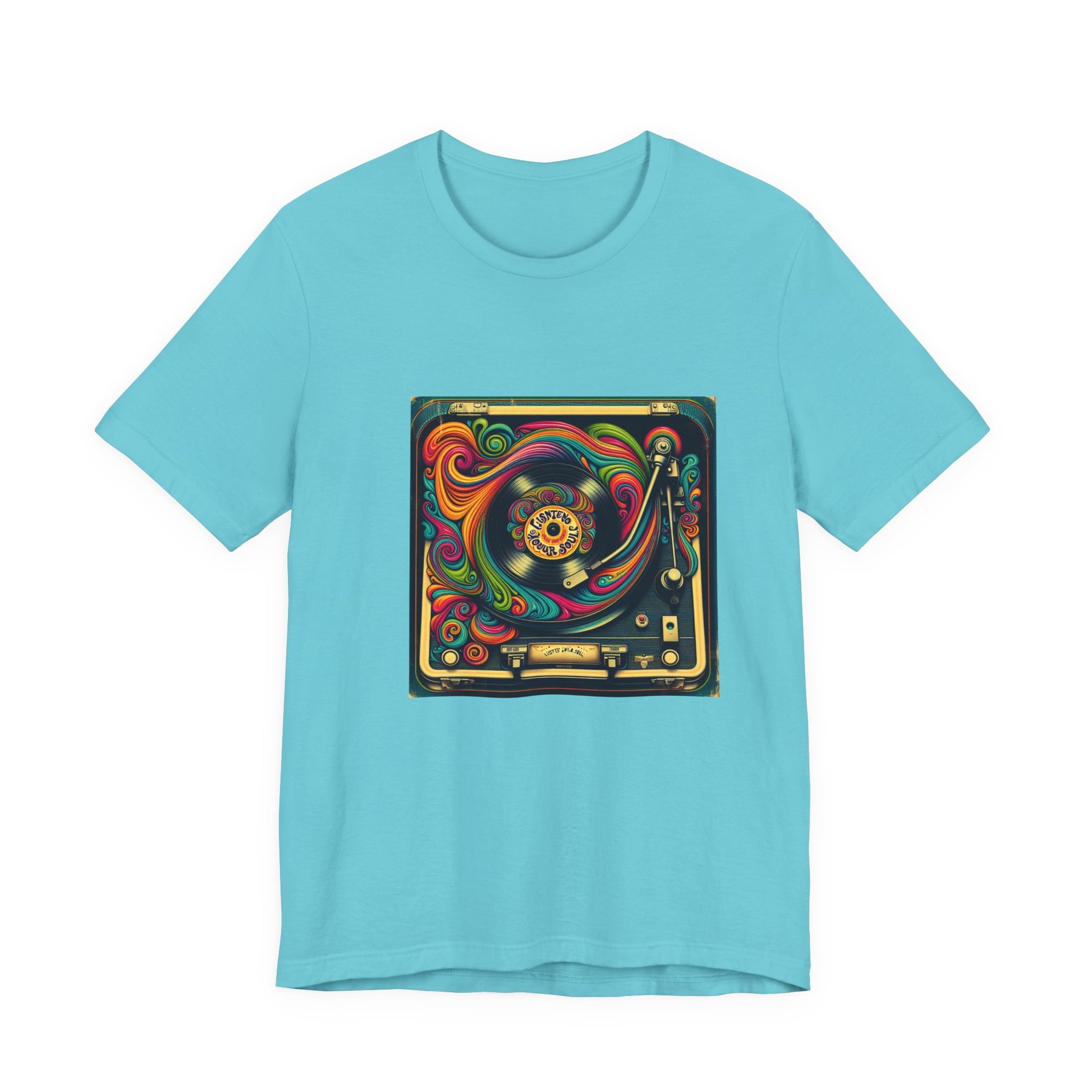 Unisex jersey short sleeve T-shirt with a psychedelic 1970s-inspired vinyl record player design and retro fonts reading 'Listen to Your Soul'. Perfect for music lovers and festival vibes.