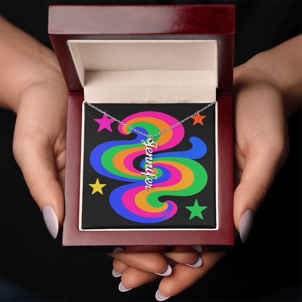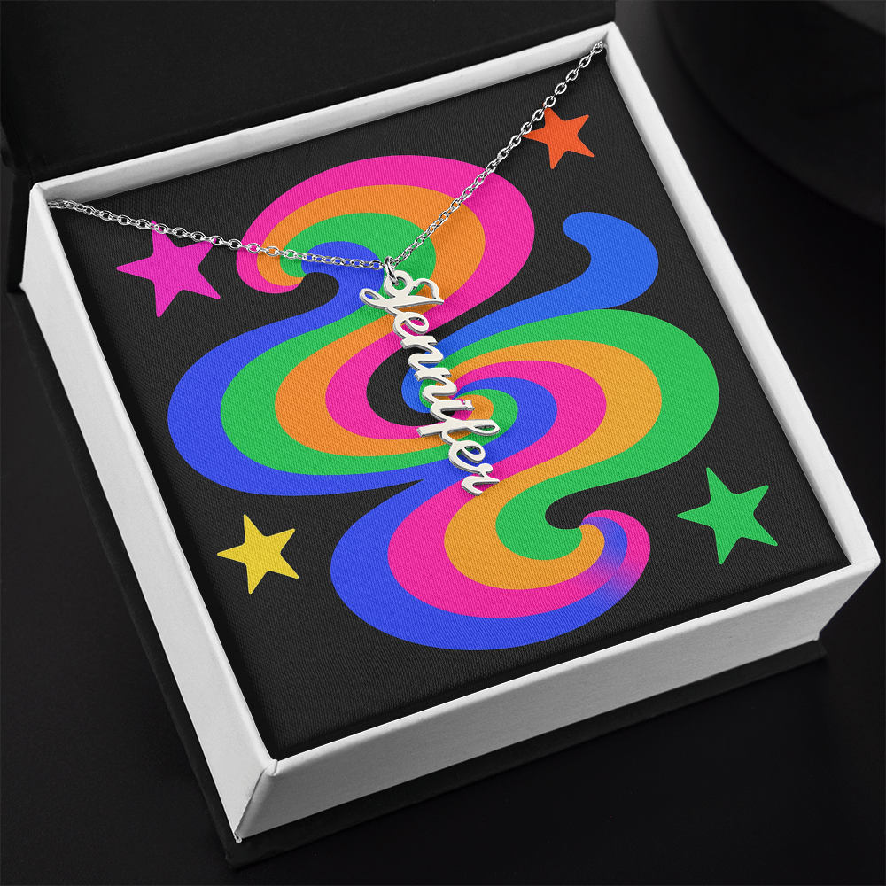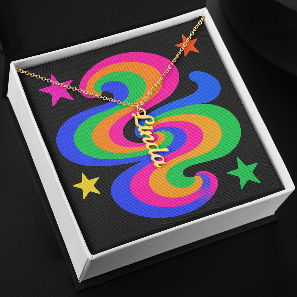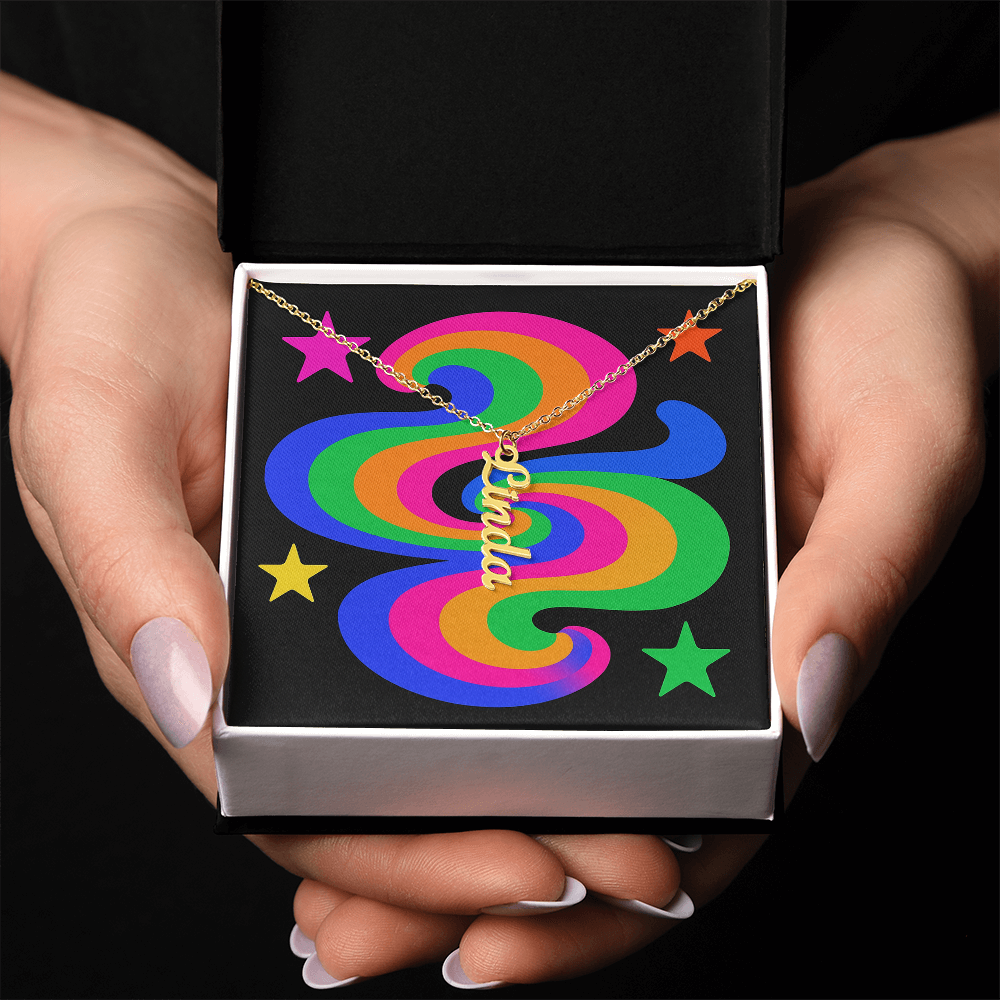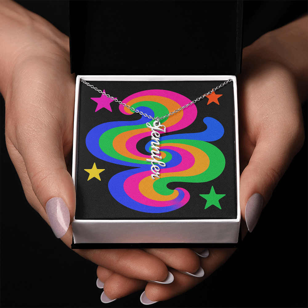 Celebrate individuality with this customisable vertical name necklace featuring they/them pronouns. The pendant is crafted from high-quality materials and is paired with a vibrant message card design. Makes a thoughtful gift for non-binary friends, partners or for yourself.